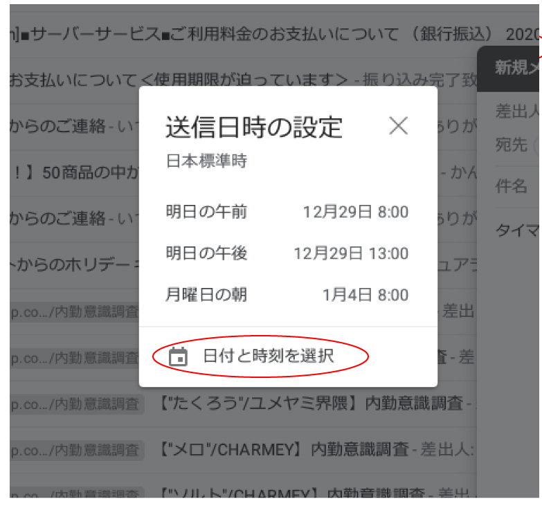 ②「送信日時の設定」画面が現れるので、任意の日時を選んで設定